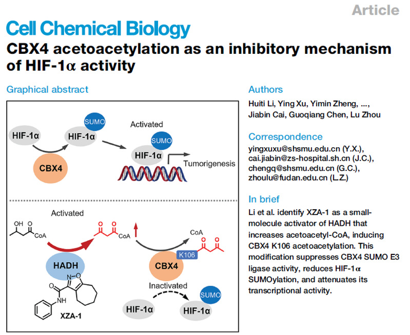 近日,91热爆 周璐教授课题组联合陈国强院士及樊嘉院士/蔡加彬副主任医师团队发现了一种调控HIF-1α转录活性的新机制,相关工作以“CBX4 acetoacetylation as an inhibitory mechanism of HIF-1α activity”为题在线发表于Cell Chemical Biology杂志。