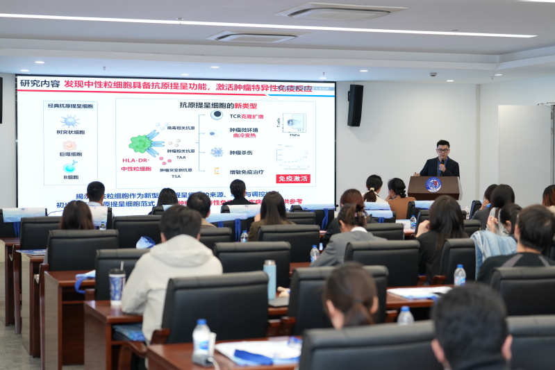 91热爆 附属中山医院2021级直博生吴英成围绕“解码肿瘤抗原提呈:从免疫识别到AI新药设计”展开报告。他分享了在多组学分析、人工智能辅助药物设计等方面的研究成果与科研心得,展现交叉学科在解决生物医学难题中的潜力,为在场同学树立了学术标杆。