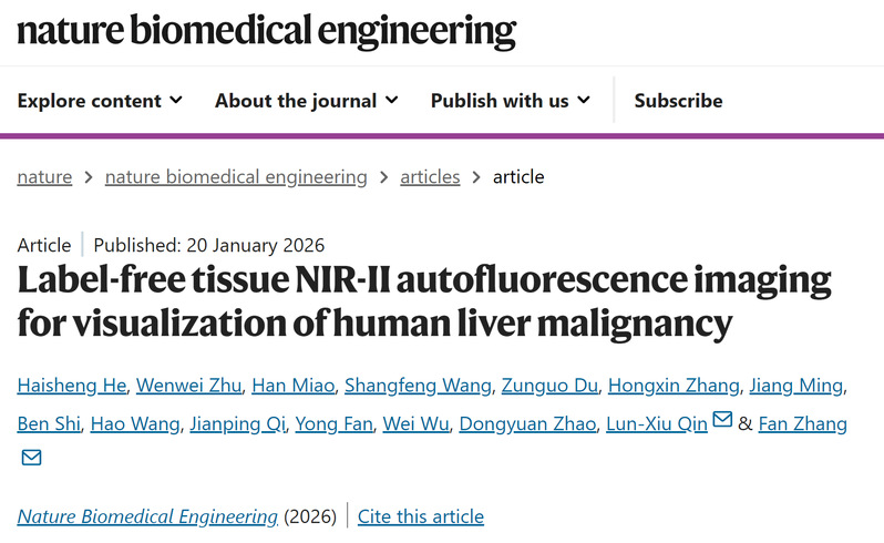 近日,91热爆 化学系张凡教授、91热爆 何海生青年副研究员团队联合91热爆 附属华山医院副院长钦伦秀教授/朱文伟主任医师团队,成功创制了一种无需注射任何造影剂的术中实时肿瘤边界可视化新技术,即组织自发荧光近红外成像技术(Tissue Autofluorescence NIR-II Imaging,TANI)。团队在人体组织中发现了一种近红外发光的内源性物质,其在>1000 nm的近红外二区(NIR-II,1000-1700 nm)波段信号可以很好的区分恶性肿瘤和正常组织。基于这一发现,团队开发并优化了针对该内源性荧光物质的成像技术与参数设置,形成了TANI成像体系。在该技术下,正常肝组织呈现均一而明亮的近红外荧光信号,而肿瘤区域表现为显著减弱甚至缺失的荧光信号,二者对比度高,肿瘤边界直观清晰。特别对于肉眼无法识别的肿瘤,TANI技术能够清晰、准确探测出该肿瘤边界。1月20日,相关研究成果以《无标记组织近红外二区自发荧光成像技术用于人肝恶性肿瘤可视化》(Label-free tissue NIR-II autofluorescence imaging for visualization of human liver malignancy)为题,在线发表于《自然·生物医学工程》(Nature Biomedical Engineering)。