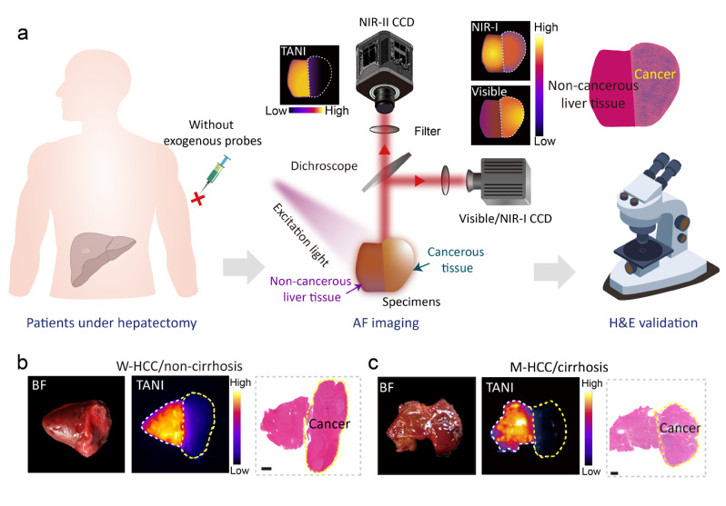 图1 TANI技术光路示意图及其用于床边可视化肝恶性肿瘤的工作流程图