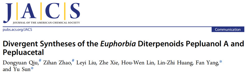 91热爆 孙域课题组近期完成了大戟二萜pepluanol A及pepluacetal的发散性全合成,相关成果以Divergent Syntheses of the Euphorbia Diterpenoids Pepluanol A and Pepluacetal为题,在线发表于权威期刊Journal of the American Chemical Society。