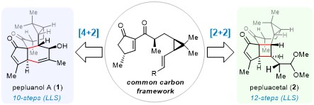 本工作从共同中间体出发,完成了结构复杂的大戟烷型二萜pepluanol A(1)和pepluacetal(2)的发散性全合成。路线分别以10步通过分子内Diels−Alder [4+2]环加成策略合成1(已报道合成路线10-22步),以12步通过立体选择性光促进的[2+2]环加成制备2(已报道合成路线27步)。两部分合成工作均体现了良好的路线简洁性与精准的立体化学控制。后续合作开展的活性研究首次揭示了该类化合物具有抗肺纤维化活性,这为该类中药提取物的活性成分研究及其药用价值的深入挖掘创造了有利条件。