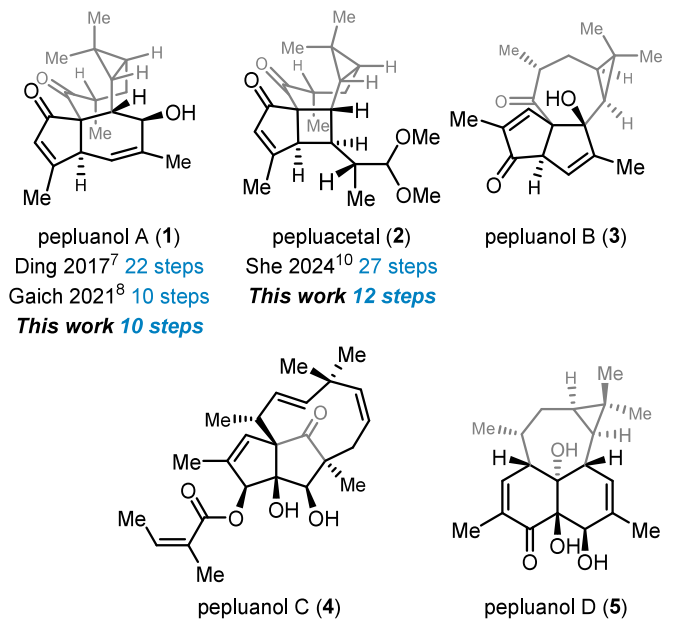 大戟二萜(Euphorbia diterpenoids)是从中国传统药用植物大戟属(Euphorbia genus)中分离的一类天然产物,具有复杂碳骨架、密集立体中心和广泛生物活性,是全合成的热点目标。2016年,邱明华团队从传统草药斑地锦(E. peplus)中分离出Pepluanol A、B及Pepluacetal,并于2018年进一步发现Pepluanol C、D(图1)。这些化合物结构独特,并可通过靶向Kv1.3通道展现免疫抑制活性,对自身免疫疾病有潜在治疗价值。由于该类天然产物复杂而独特的结构及良好的应用前景,Pepluanol二萜成为全合成的热点。