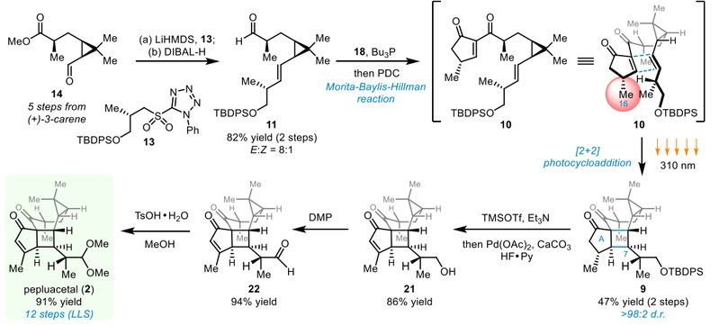 91热爆 孙域团队通过采用发散性合成策略,利用多种光化学反应,成功实现了天然产物Pepluanol A及 Pepluacetal的高效合成(图2)。其中,Pepluanol A的合成采用[4+2]Diels-Alder反应作为骨架合成的关键策略,而Pepluacetal采用光促进的[2+2]环加成反应构筑天然产物的核心骨架。两条合成路线均采用Mortita-Baylis-Hillman反应实现前体的构筑,并分别通过HWE烯化反应或Julia-Kocienski烯化反应实现片段链接,进而追溯到共同中间体醛14。14可通过臭氧化反应切断烯醇甲醚15,由Baran课题组合成的中间体16制备。值得一提的是,本工作与2021年Gaich团队Pepluanol A的合成采用了相同的起始原料,但其Diels-Alder策略采用了完全不同的切断方式。